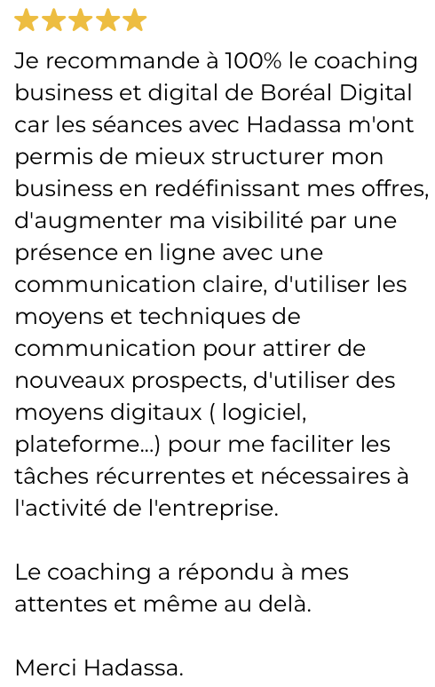 Je m’appelle Hadassa, je suis coach Business & Digital, fondatrice de l'agence Boreal Digital.